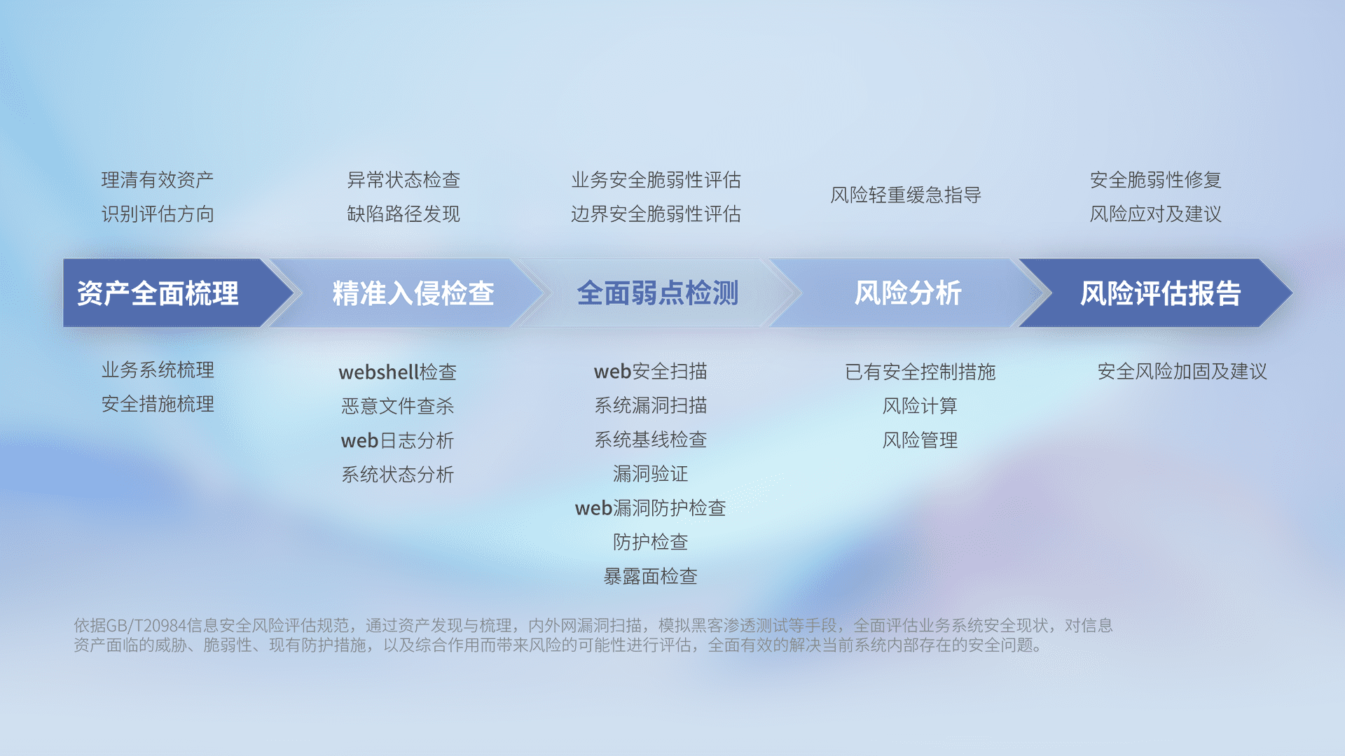 针对客户行业特性,,,以专业的安全服务+多厂商联合解决方案提供专属的一站式安全管理服务,,,,帮助客户全面感知网络空间威胁,,基于识别、、、检测、、分析、、、、防护、、监测、、、、响应的服务理论模型,,,从方案咨询、、、、集成交付、、、评估验证、、、、优化加固、、、、运维运营,,致力于为客户提供完整的闭环管理式安全服务。。。。以实战经验为客户打造高抵御风险的安全体系,,帮助客户发现威胁、、、、对抗威胁、、处置威胁,,不断积累安全对抗能力,,,,持续保障数字化安全。。